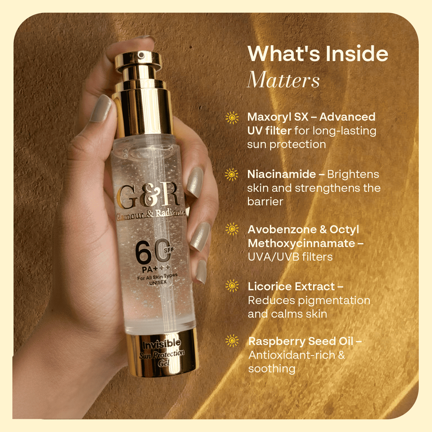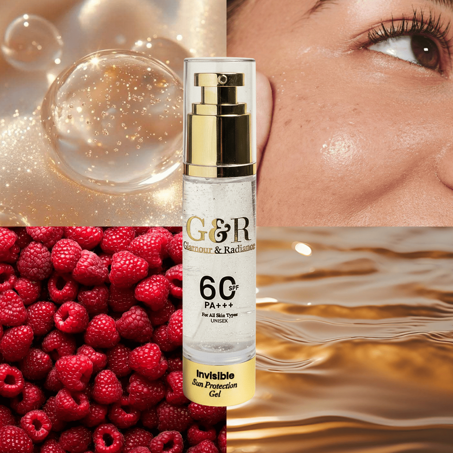 Shield your skin with the Glamour & Radiance Invisible Sun Protection Gel, a broad-spectrum SPF 60 PA+++ formula designed for all skin types. Lightweight, non-sticky, and invisible on all skin tones, this unisex gel delivers powerful UVA/UVB protection while nourishing the skin with Liquorice, Niacinamide, and Raspberry Extract.