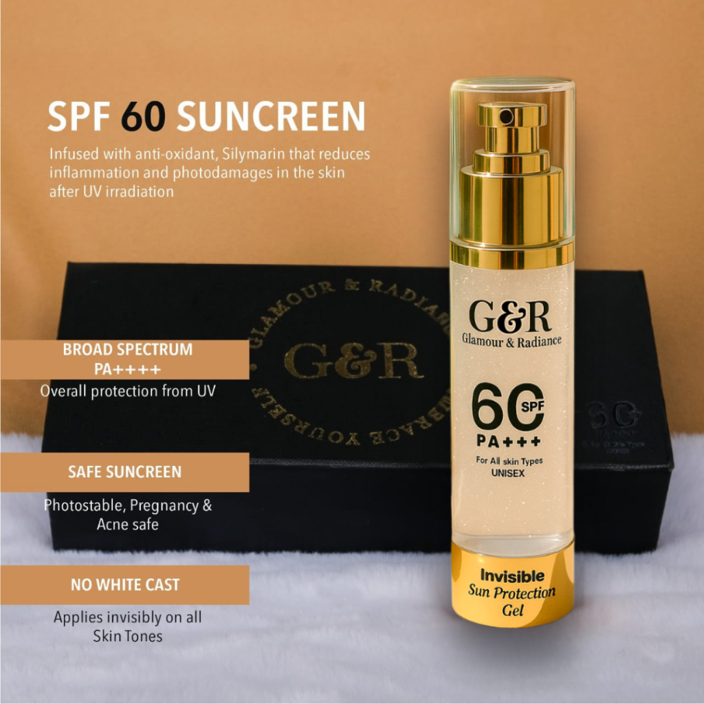 Protect your skin all day with Glamour & Radiance Invisible Sun Protection Gel SPF 60 — a premium, fast-absorbing sunscreen gel that offers high-level broad-spectrum protection without white cast. Formulated for everyday use, this non-sticky, lightweight gel layers seamlessly under makeup to keep skin safe from UVA/UVB damage while preserving a natural finish.