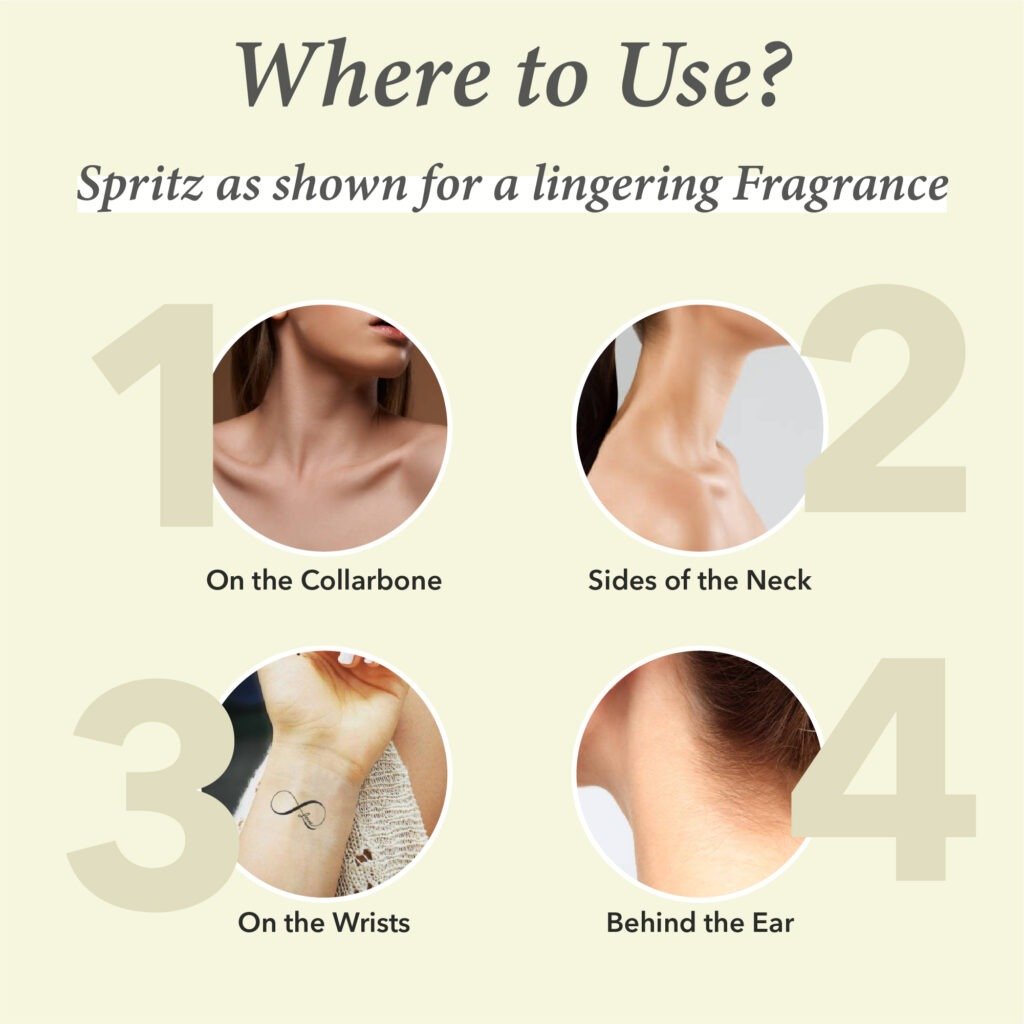2. Spray lightly on pulse points — wrists, neck, behind ears, and clothes.